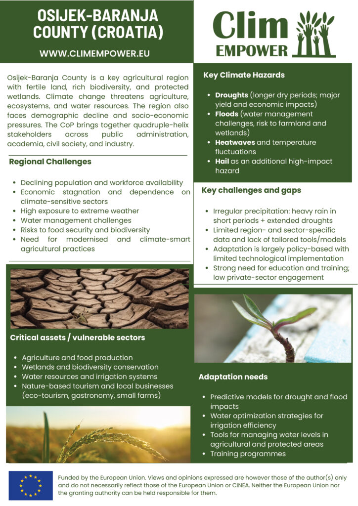 Climate change in our region has had a great negative impact on nature and agricultural land in the form of extremely high temperatures, droughts, hail, lack of water when needed the most, and floods resulting in the reduction of food production, desiccation of farming land and wetlands and the disappearing of habitats for many animal and plant species. Climate change has also had a negative impact on social development through the decline of income and employees in food processing and agriculture and in branches like tourism – outdoor activities in nature (hiking, biking, sport angling, birdwatching, boat touring etc.) combined with gastronomy (local homemade food produced at small family farms) are one of the most important elements of the tourist offer in Osijek-Baranja County.