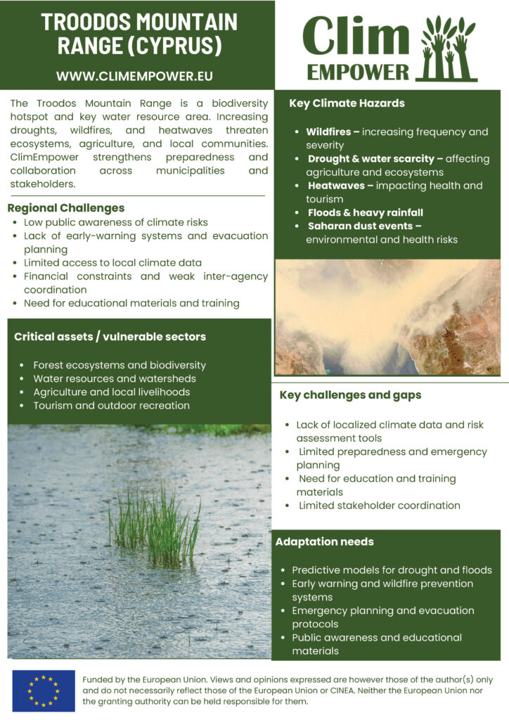 The key elements that affect the fire danger in Cyprus are: the Mediterranean climate of the island with a prolonged hot and dry summer period and strong local winds, the vegetation characteristics such as the ground cover density and fuel moisture and the topography; characterized by a rugged terrain and steep slopes. In 2021, wildfires ravaged 6,199 hectares, accounting for 3.6% of Cyprus’s total forest area. This marked a significant increase from the 3,421 hectares burned in 2020 and was followed by a decrease, which still represented a considerable area, to 2,540 hectares in 2022.